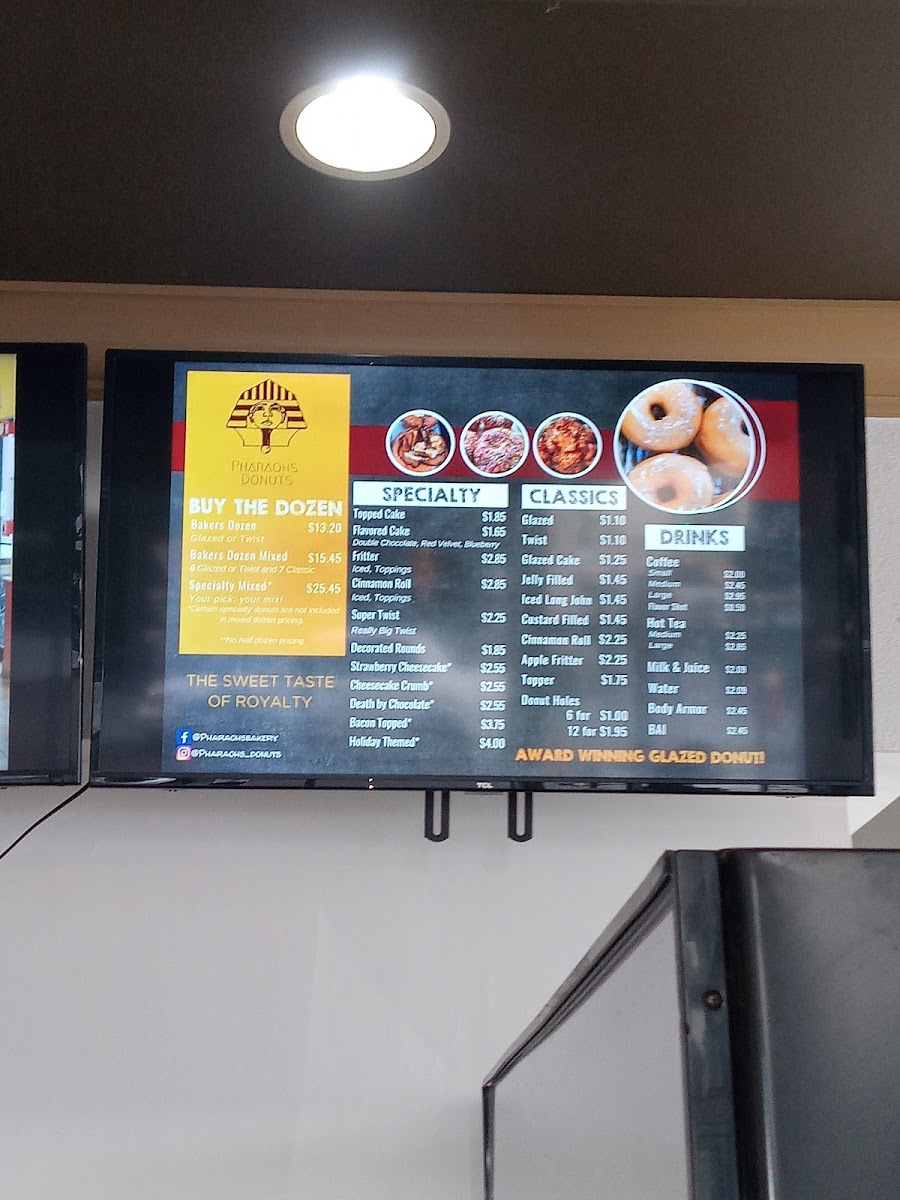 The menu at Pharaohs Donuts offers a straightforward and comforting selection that revolves around fresh, classic donut varieties and simple café drinks. It’s the kind of place where you can enjoy a familiar sweet treat alongside a cup of coffee, making it perfect for a quick morning stop or an afternoon break.